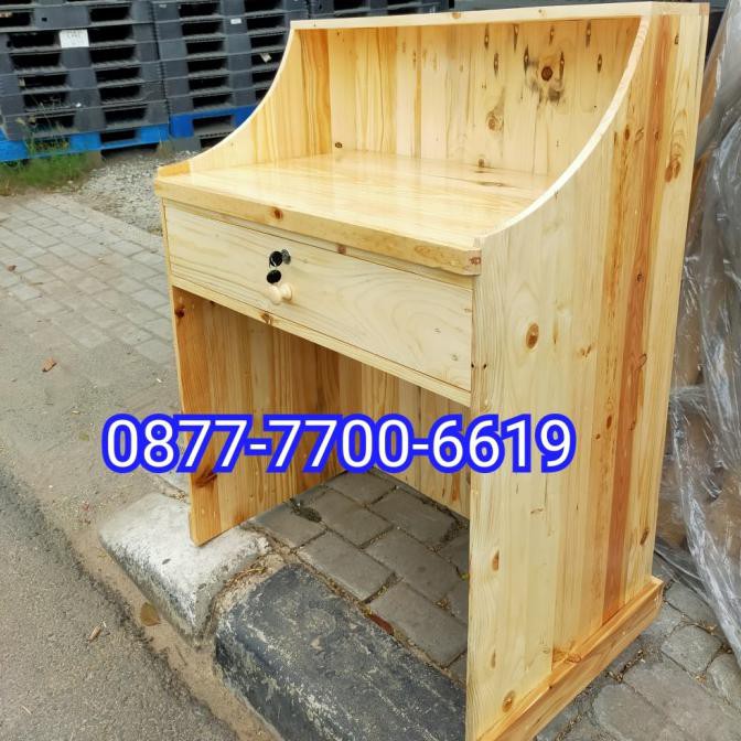 Di meja kasir, biasanya seorang kasir akan memasukkan kode barang yang dibeli oleh pelanggan ke dalam sistem. Dengan tambahan rak di sisinya yang digunakan untuk display berbagi produk fats moving yang dengan mudah di akses pelanggan. Meja kasir dengan ornamen kayu ini dapat digunakan pada segala jenis usaha, terutama usaha restoran atau butik. Selain itu, mereka juga bertugas untuk melakukan perhitungan jumlah total penjualan per hari, per minggu, ataupun perbulan. Jual meja minimalis resepsionis hotel perkantoran cafe restoran dengan harga rp3.000.000 dari toko online wis_wis, kab.